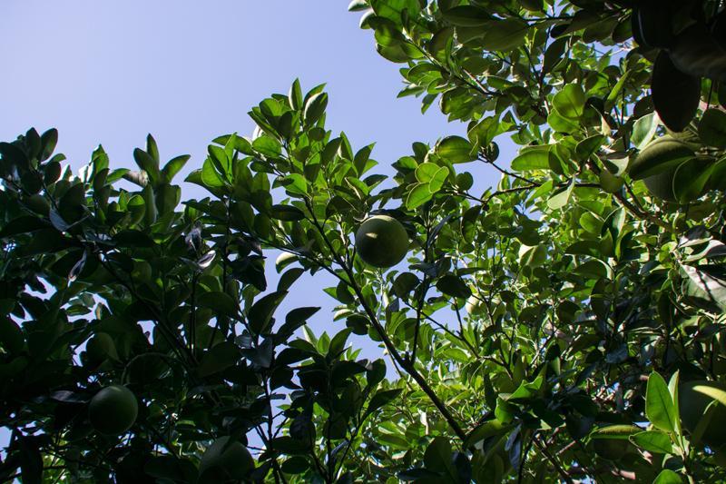 烈日高掛,空氣中瀰漫著炙熱的氣息,土地被陽光烘烤得微微發燙。柚子樹在這樣的環境下依然努力生長,每一片翠綠的葉子都迎向陽光,吸收著養分,為即將成熟的果實提供能量。