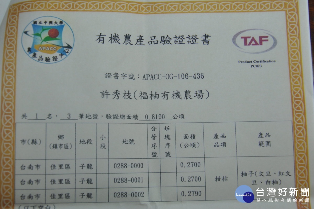 有機文旦園認證證書。